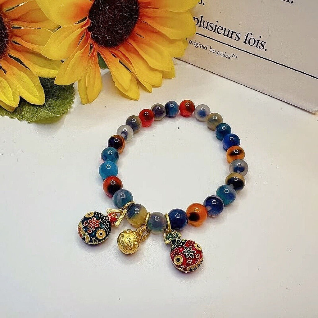 This bracelet features the Gold Swallowing Beast, a symbol of wealth and good fortune. The sugar heart agates add a sweet touch to this auspicious piece.