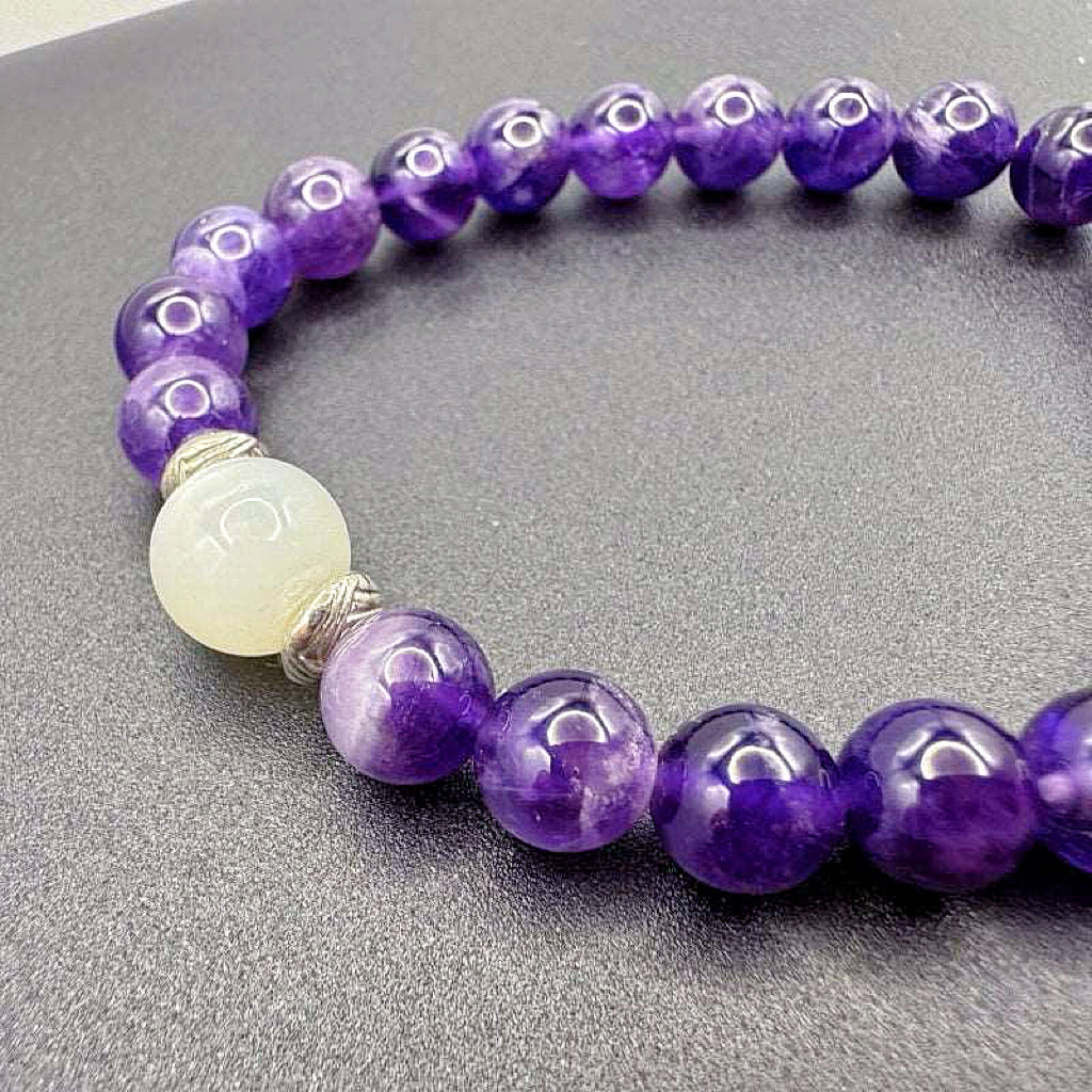 This amethyst moonstone bracelet perfectly combines the mysterious and noble amethyst with the moonstone as warm as moonlight, showing a unique beauty. The deep purple luster of amethyst and the shining light of moonstone are intertwined, just like the reflection of stars in the night sky, giving people a peaceful, elegant and mysterious atmosphere. The exquisite bead design not only highlights the wearer's temperament, but also brings deep strength and peace of mind to every wearer.
