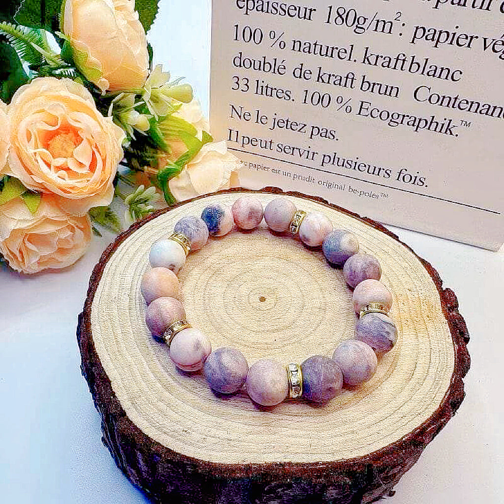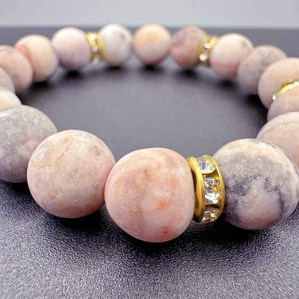 This pink zebra diamond frosted stone beaded bracelet combines elegant pink tones and unique zebra textures, showing a unique artistic beauty. Each frosted stone bead of the bracelet has been carefully polished to show a hazy texture and delicate luster, making the overall design low-key yet unique. The inlaid diamond embellishment adds a sense of luxury and sophistication to this bracelet. The shining light can not only attract attention, but also give the wearer a sense of elegance and confidence.