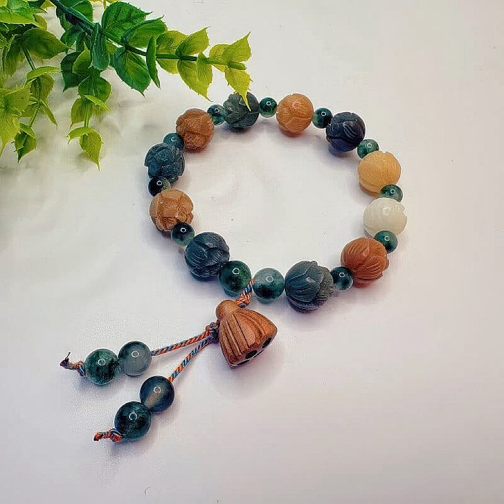 Vibrant agate with a charming God of Wealth detail. The lotus and bodhi root add a serene touch. A great accessory for daily wear or special occasions.